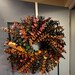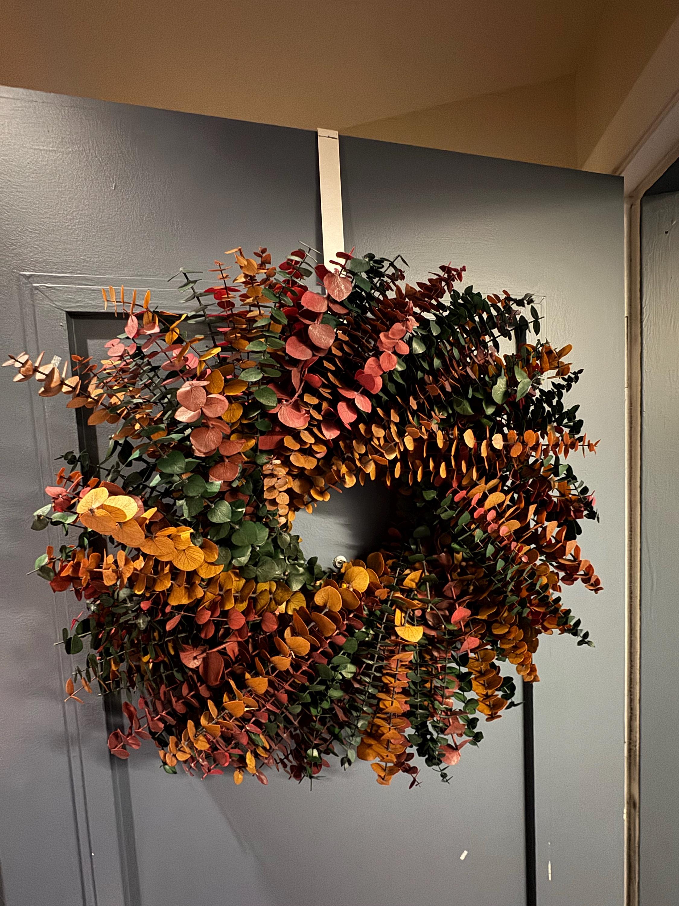 Orange, red and amber preserved eucalyptus are elegantly alternated to create an XL fall wreath. Green, red, and amber combination is also shown in the last pictures.