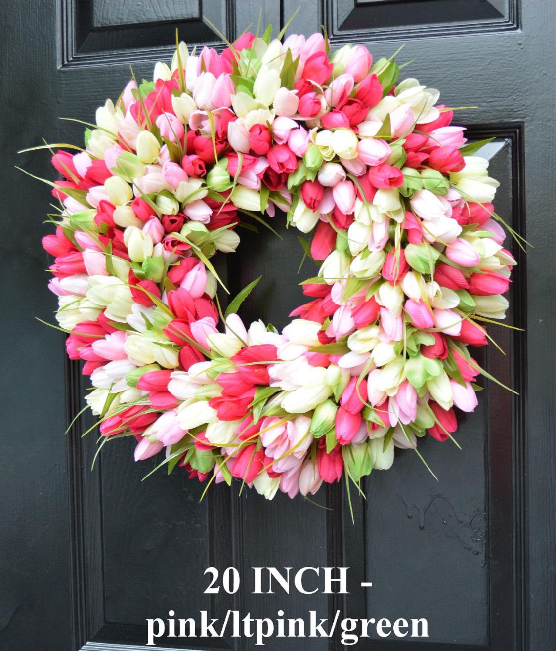 A plethora with beautiful shades of silk tulips gathered in this wreath. What a way to welcome spring! This large wreath is perfect for your front door or indoor space. Wreath sizes available from 16-26 inches in diameter (from edge of flowers to the opposite edge) and 5-6 inches deep. The silk flowers were carefully arranged onto a beautiful grapevine wreath backing. A beautiful wreath that will last for years.