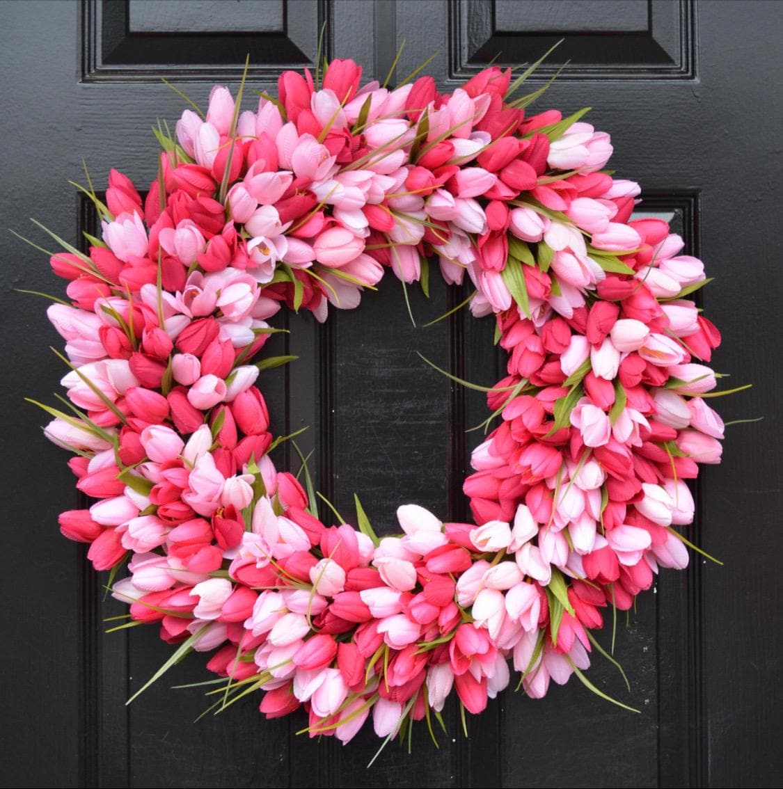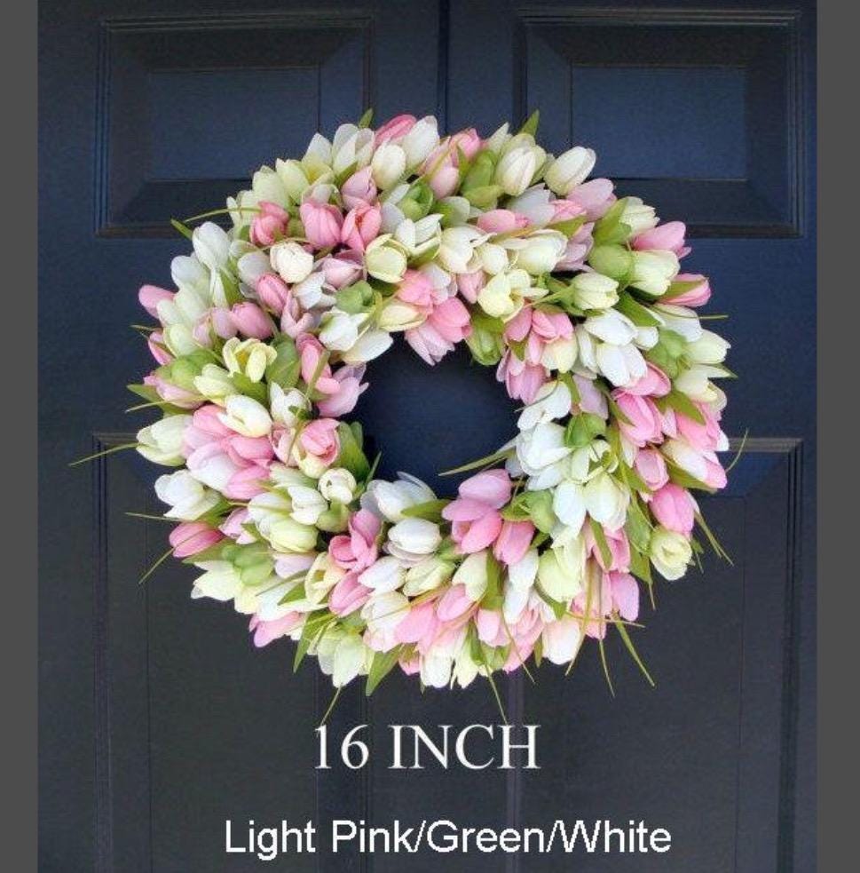 My BESTSELLING and LIMITED tulip wreath shown in the first picture contains hundreds of beautiful pink and white silk tulips. This large wreath is perfect for your front door or indoor space. The wreath sizes available range from 14-26 inches round and 4 inches deep. The silk flowers were carefully arranged onto a beautiful grapevine wreath backing. A beautiful wreath that will last years.