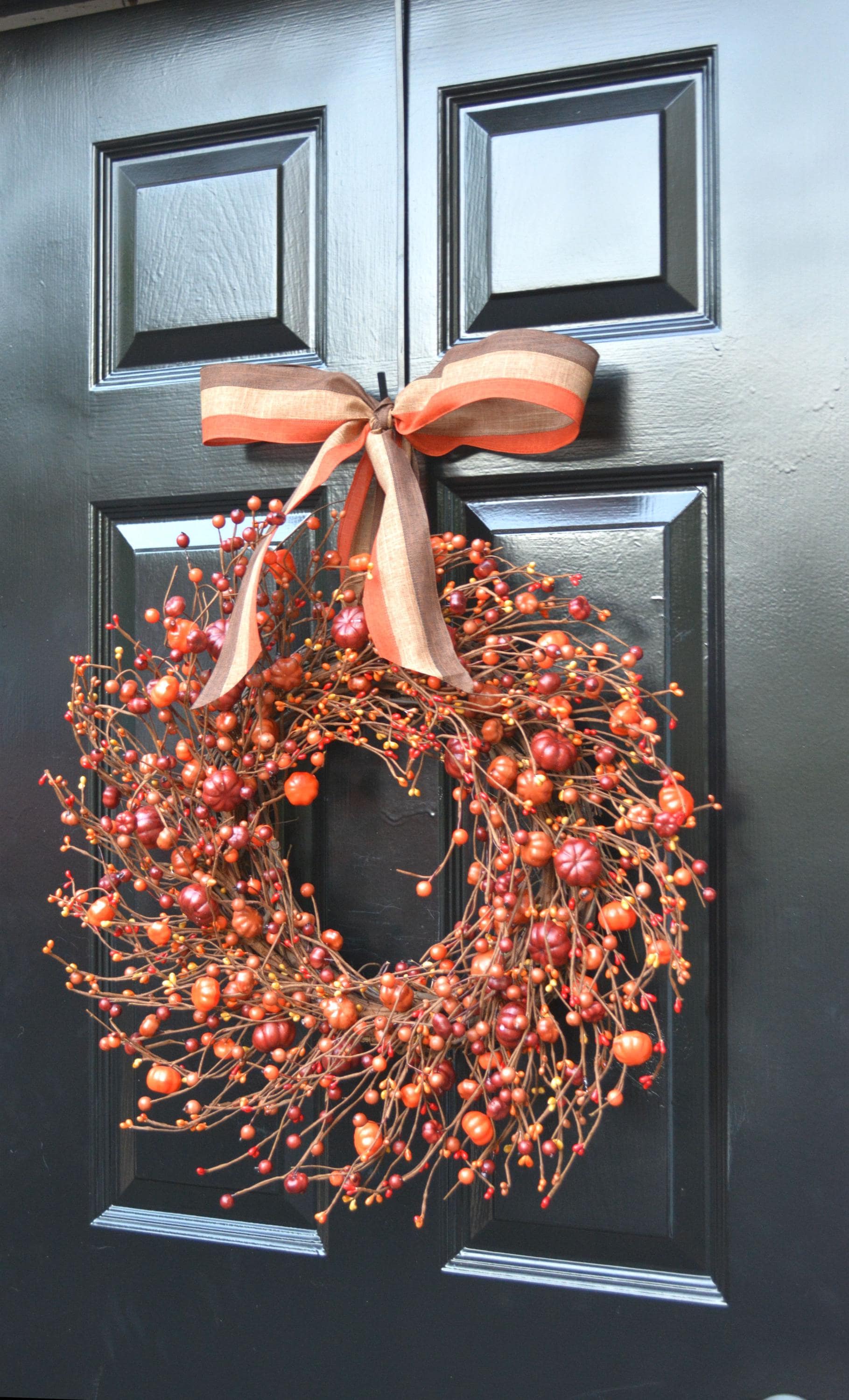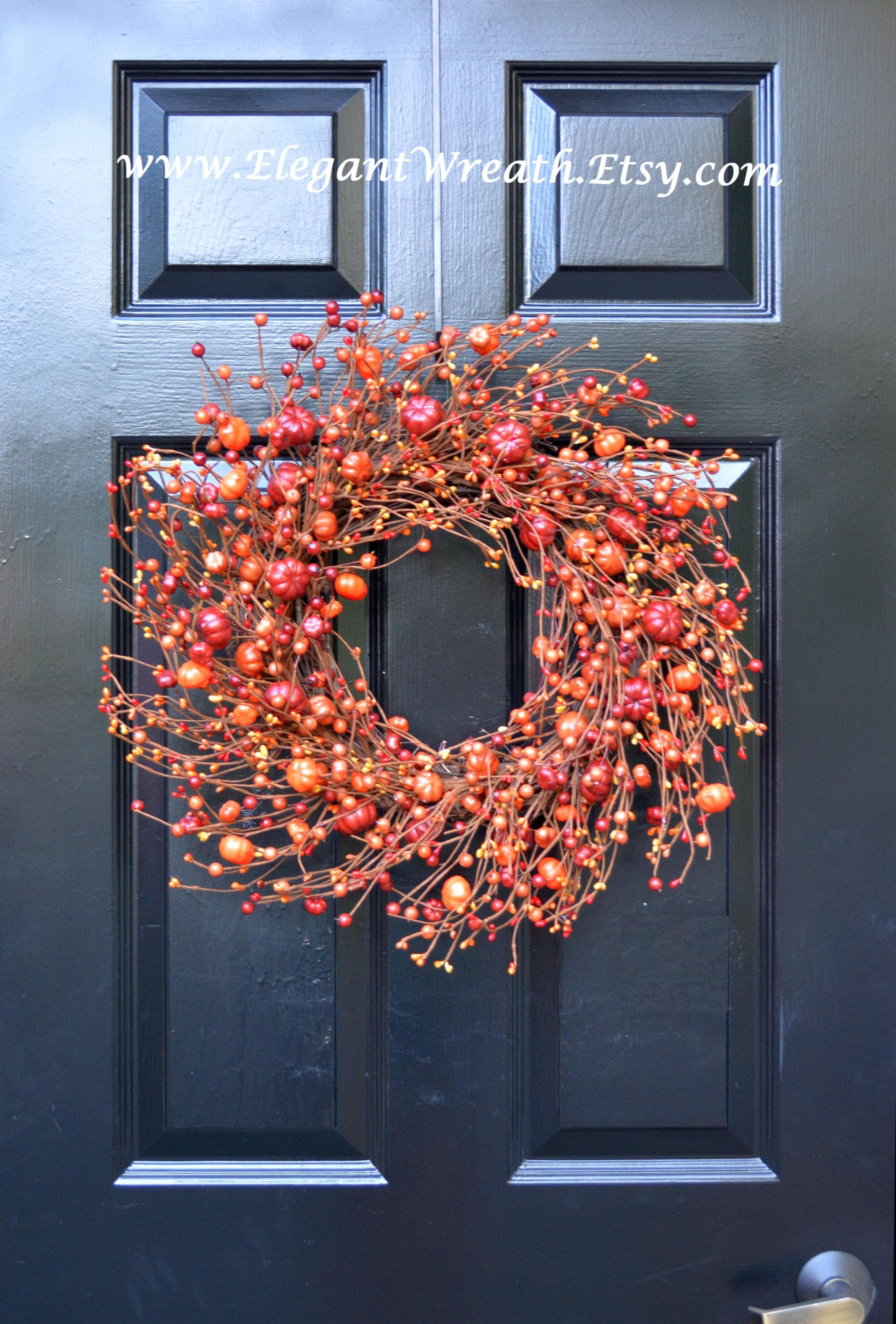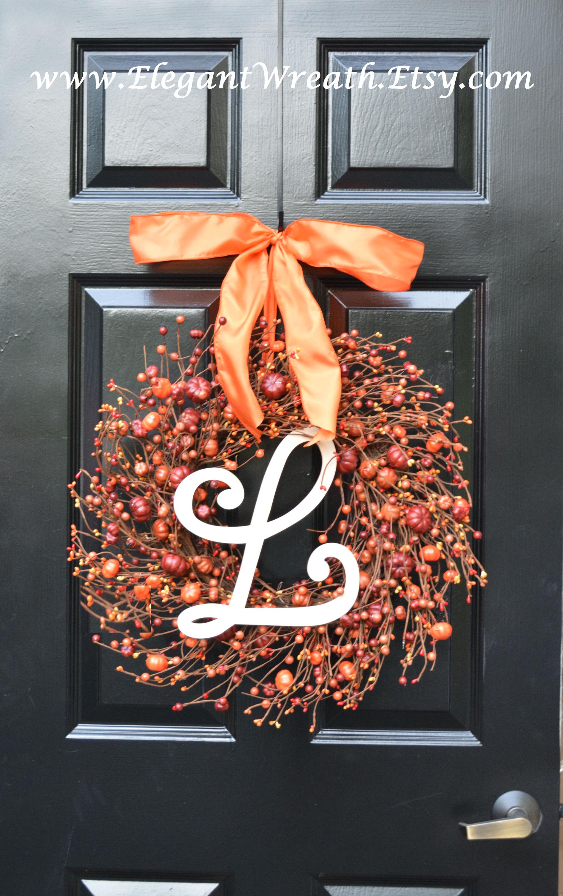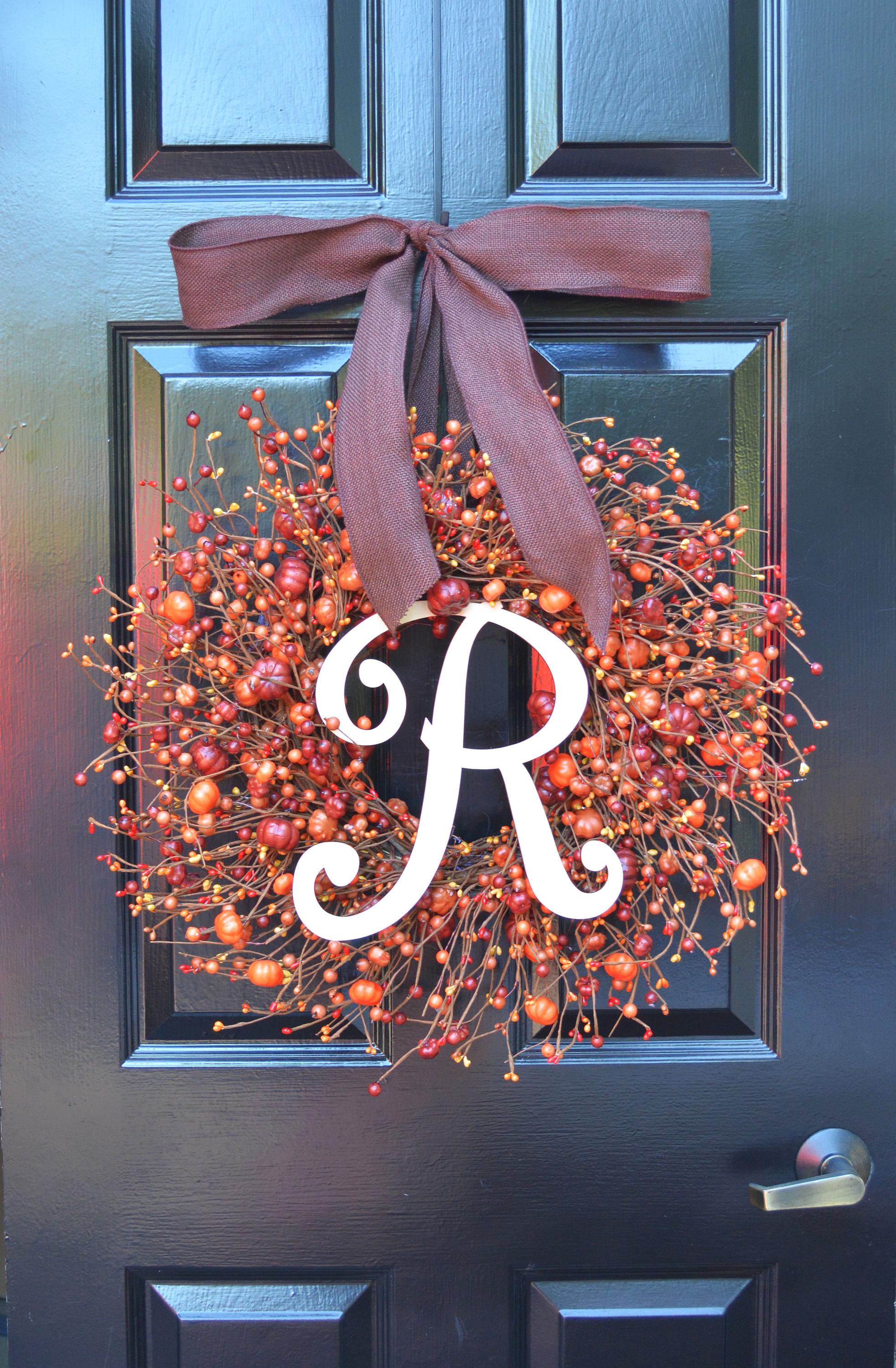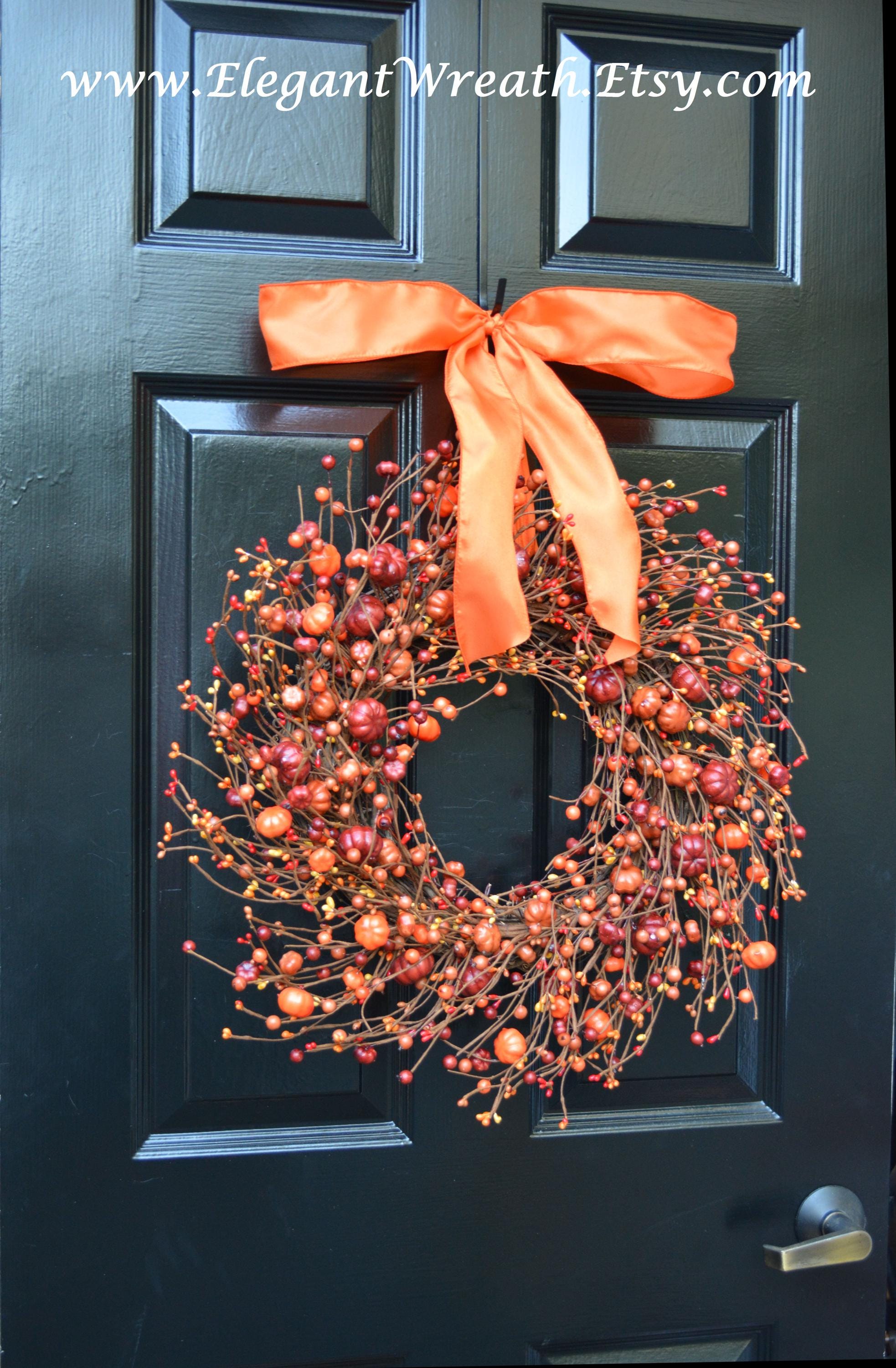 This large year round artificial pumpkin and orange berry wreath measures 18 inches in diameter and 4 inches deep. This wreath may be able to fit in between a storm door.