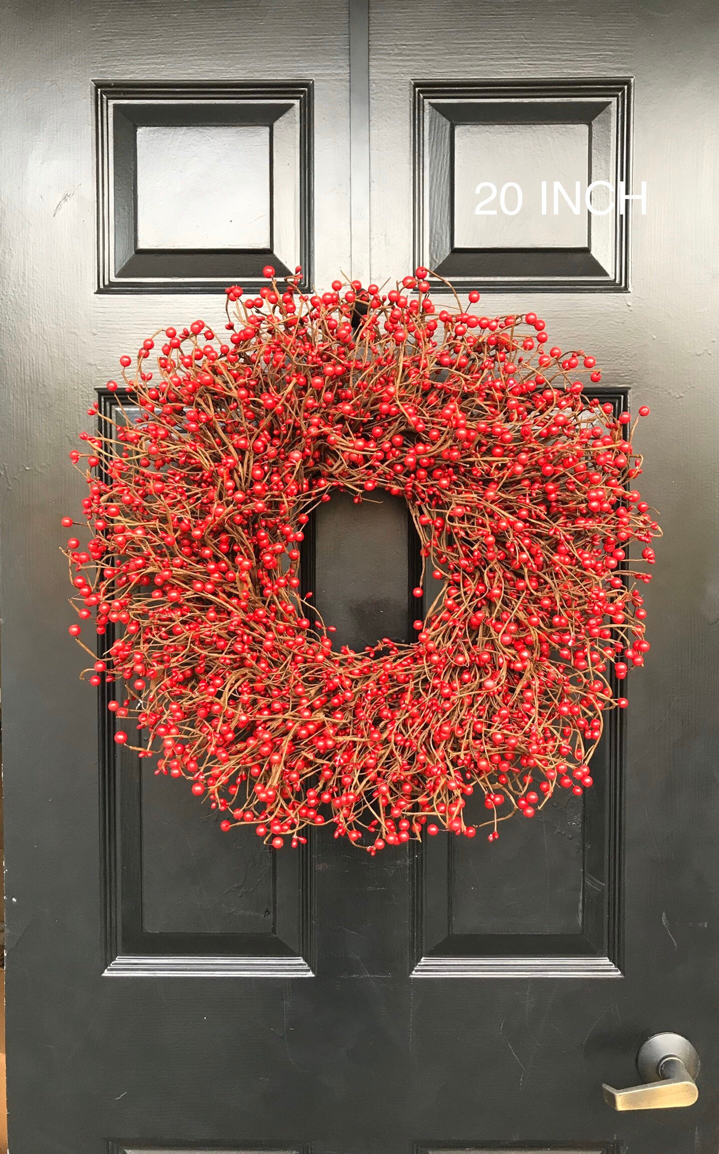 Choose a red berry wreath in the size, and with additional options such as bow and/or monogram. First picture shows a red berry wreath which measures 20 inches in diameter and 4 inches deep. This wreath may be able to fit in between a storm door. Full overhead coverage is recommended. Available in sizes 16-24 inches in diameter.